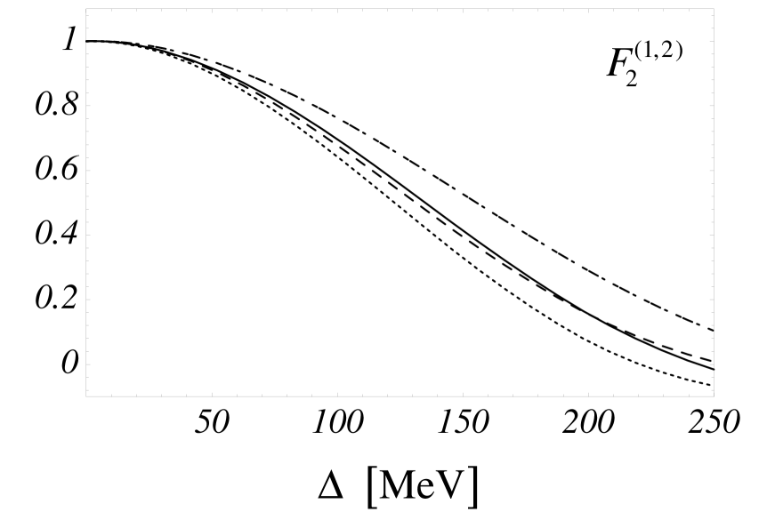 Thus, in a pure Fermi gas model the correlator is proportional to , i.e. only central correlations appear. However, it is well-known that tensor correlations strongly influence the parameters of the mesonic seagull amplitude . For instance, tensor correlations give the biggest contribution to the value of the enhancement constant [17]. In order to obtain a quantitative description of the effect of tensor correlations, a modified Fermi gas model was considered in [9], where a correlation function was obtained in a perturbative way by evaluating three-nucleon diagrams and additional two-nucleon diagrams. We represent the correlation function, eq.โ(14), in the following form