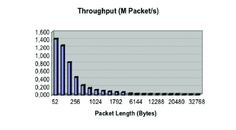 As was expected, Figure 5 shows that the throughput achieved for packets of a length of less than 64 bytes is lower than that achieved in SPM, but is still higher than 1,2 M Packet/s, which means that the LPM can also be used with these packet lengths on the interfaces with a trigger rate of about 1,1 MHz.