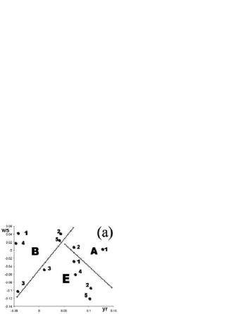 IDH. There is an interesting set of indices which can be computed from dinucleotide frequencies. The so called index of DNA homogeneity (IDH) was proposed by Miramontes et al [25] and is defined for a binary sequence as . We define , , and . This index expresses the degree of local homogeneity of the sequence: long stretches of 0 or 1 will cause to be near 1, while strong alternation will push it toward -1. The three indices , and are not independent, and since is the least meaningful of the binary projections, the choice in [25] was to plot the species in the plane. The corresponding map with our own data is in Graphic 2a. Graphic 2b displays the distribution of the values in the sequences of some species. Both the specificity and the classificatory power of IDH can be clearly noted.
