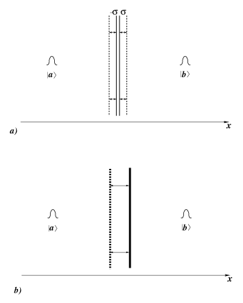For a charged particle this can be achieved by moving two large oppositely charged parallel plates located between the wave packets; see Fig. 4. The two plates are placed originally one on top of the other, i.e., there is no charge distribution and, therefore, there is no electric field anywhere. The plates are then moved a distance apart and then, after short time , they are brought back. We will call such an operation βopening a condenserβ. Opening the condenser with charge density will lead to the change of the relative phase of the particle with charge equal