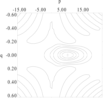 The plot of this Wigner function is presented in Fig. 6. Unlike the case of a free particle, “vacuum perturbations” increase as here. They may be seen as the large negative domain near the origin of coordinates.