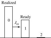 With nRule (4) in place, probability current cannot initially flow from either of the intermediate states to the final state, for that would require current flow from a ready state. The dashed lines in Fig. 5 indicate the forbidden transitions. But once the state (or ) has been stochastically chosen, it will become a realized state (or ) and a subsequent transition to can occur that realizes .